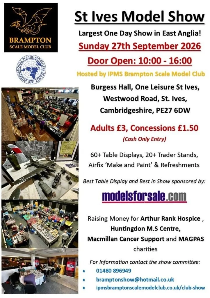 Clubs, SIG’s, traders, open competition, tombola, Airfix “Make & Paint”, bar/restaurant serving hot food/refreshments, free wifi and free parking.